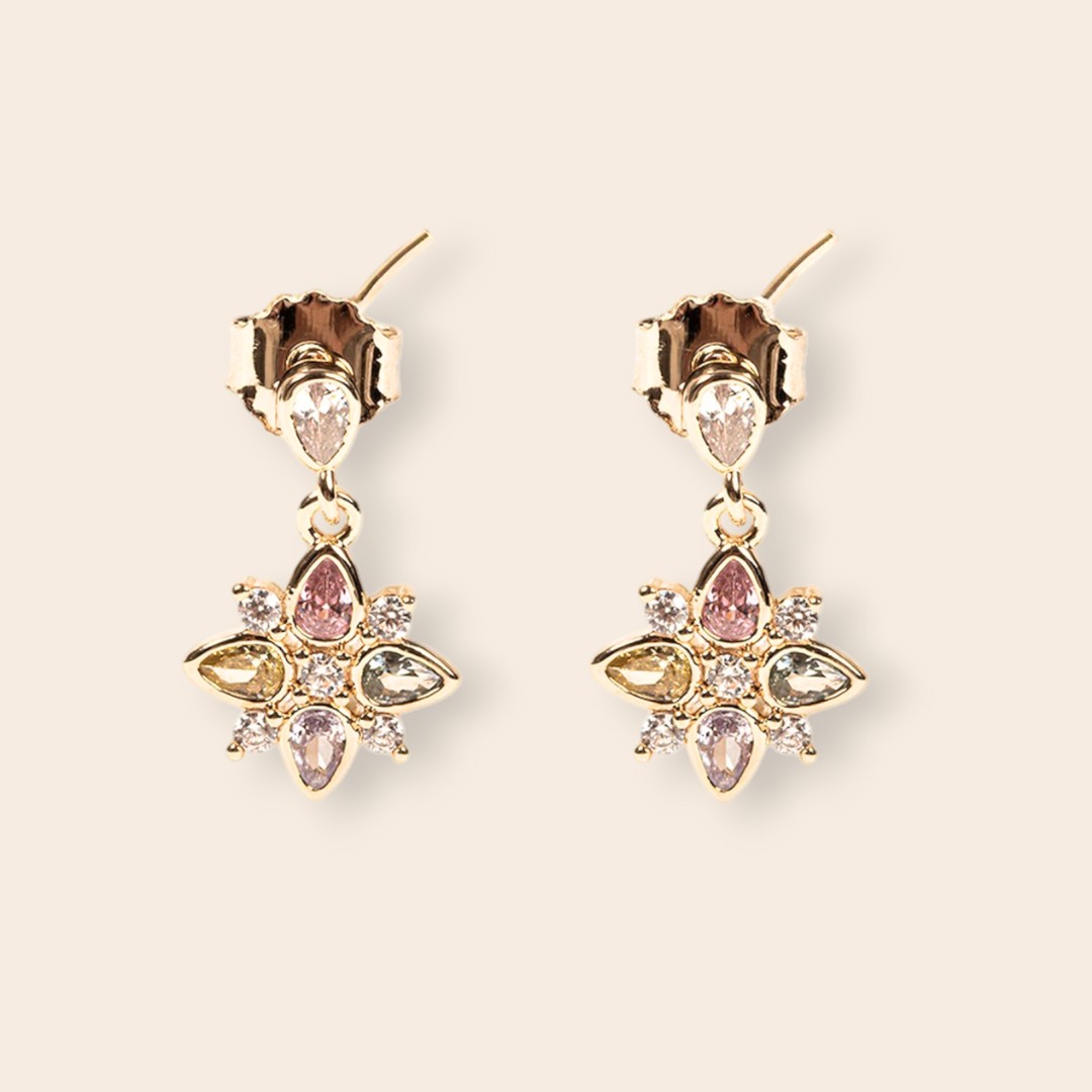 Boucles cristaux multicolores, modèle sertis de cristaux rose, vert d’eau, violet, jaune et blanc.