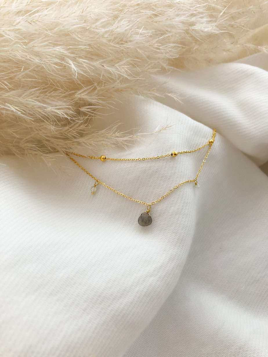 Bracelet goutte en Labradorite , double chaîne boules plaqué or et chaîne multi perles
