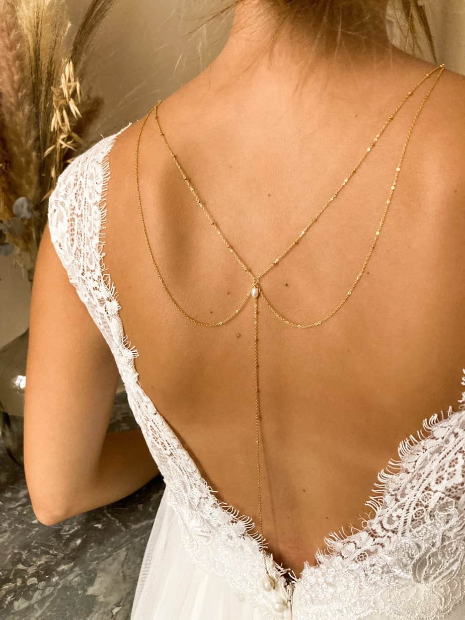Collier de dos ailettes chaine perlée et perle d’eau douce en acier inoxydable doré, raffiné apportant de l’élégance et de la finesse à la tenue.