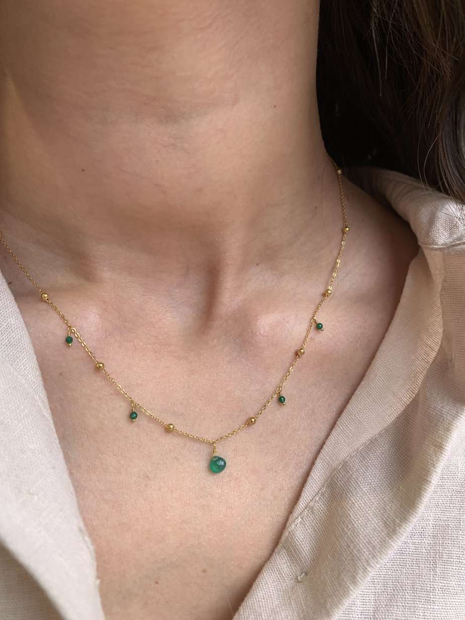 Collier gouttes en Quartz vert ( Pierre naturelle verte) multi perles et chaîne boules en plaqué or,
