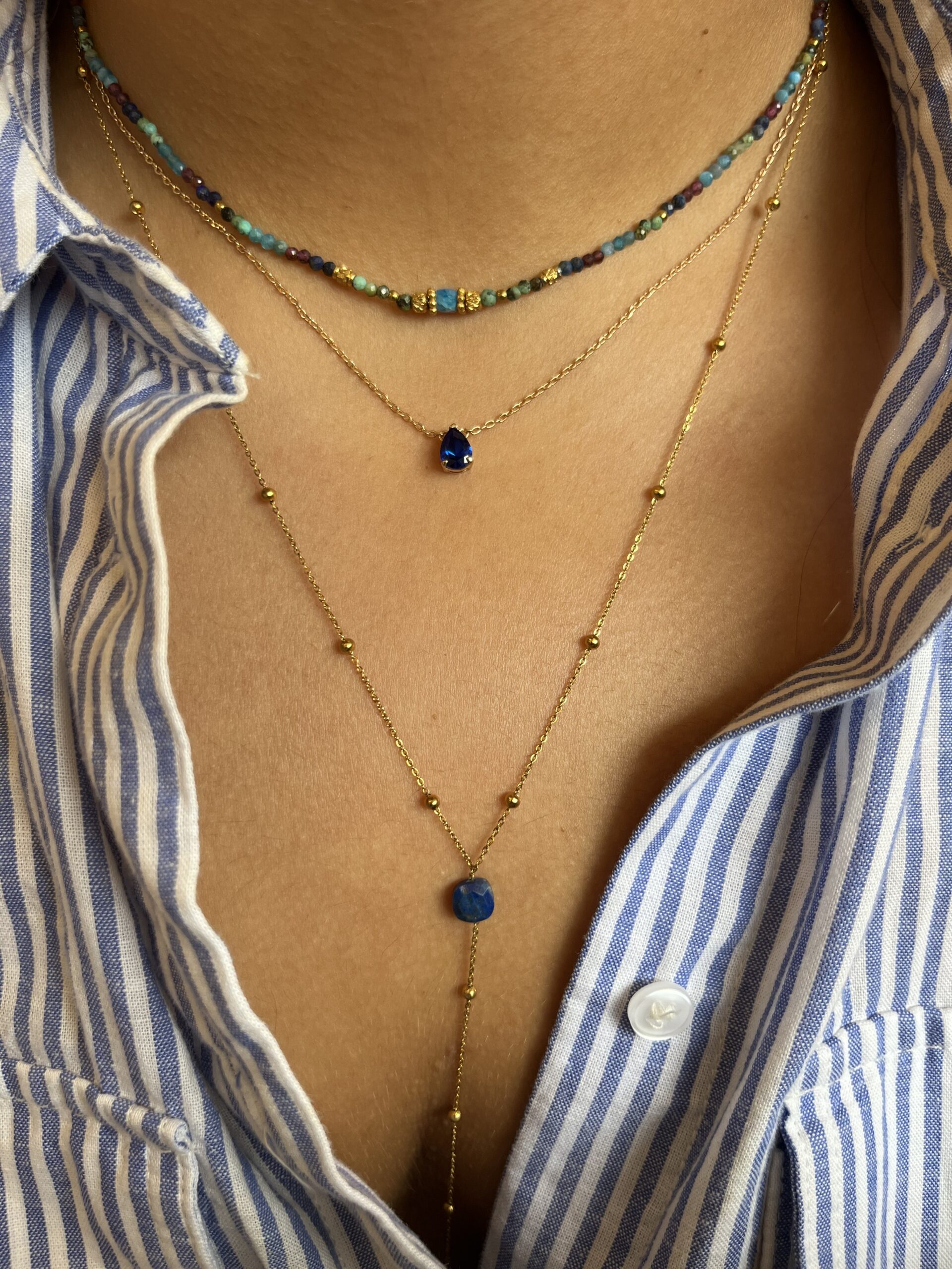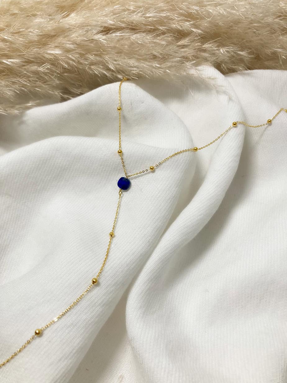 Collier Y Lapis lazuli (collier cravate) chaine perlé en plaqué or, pierre de lapis lazuli, cette pièce apportera finesse et élégance à votre décolleté.